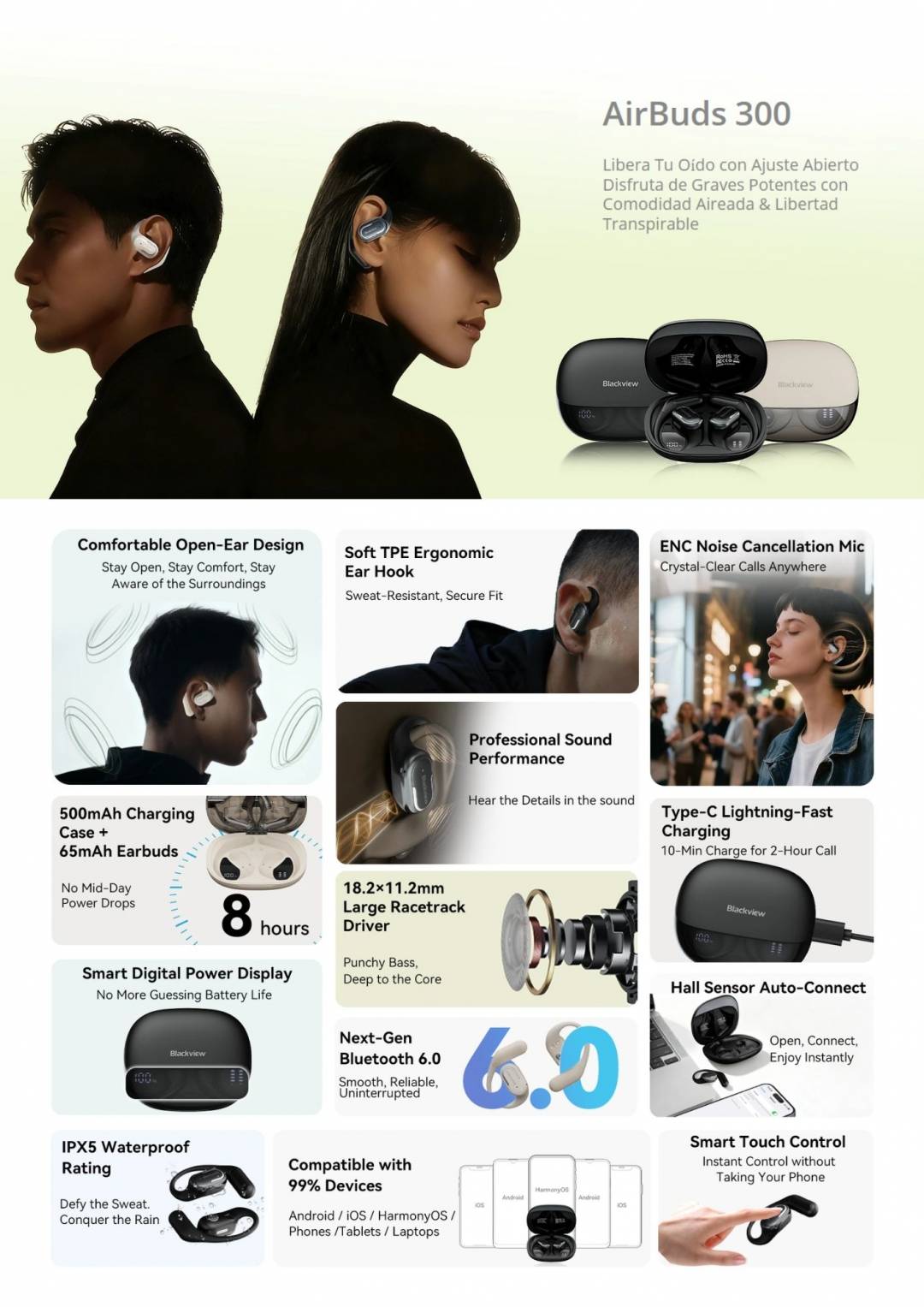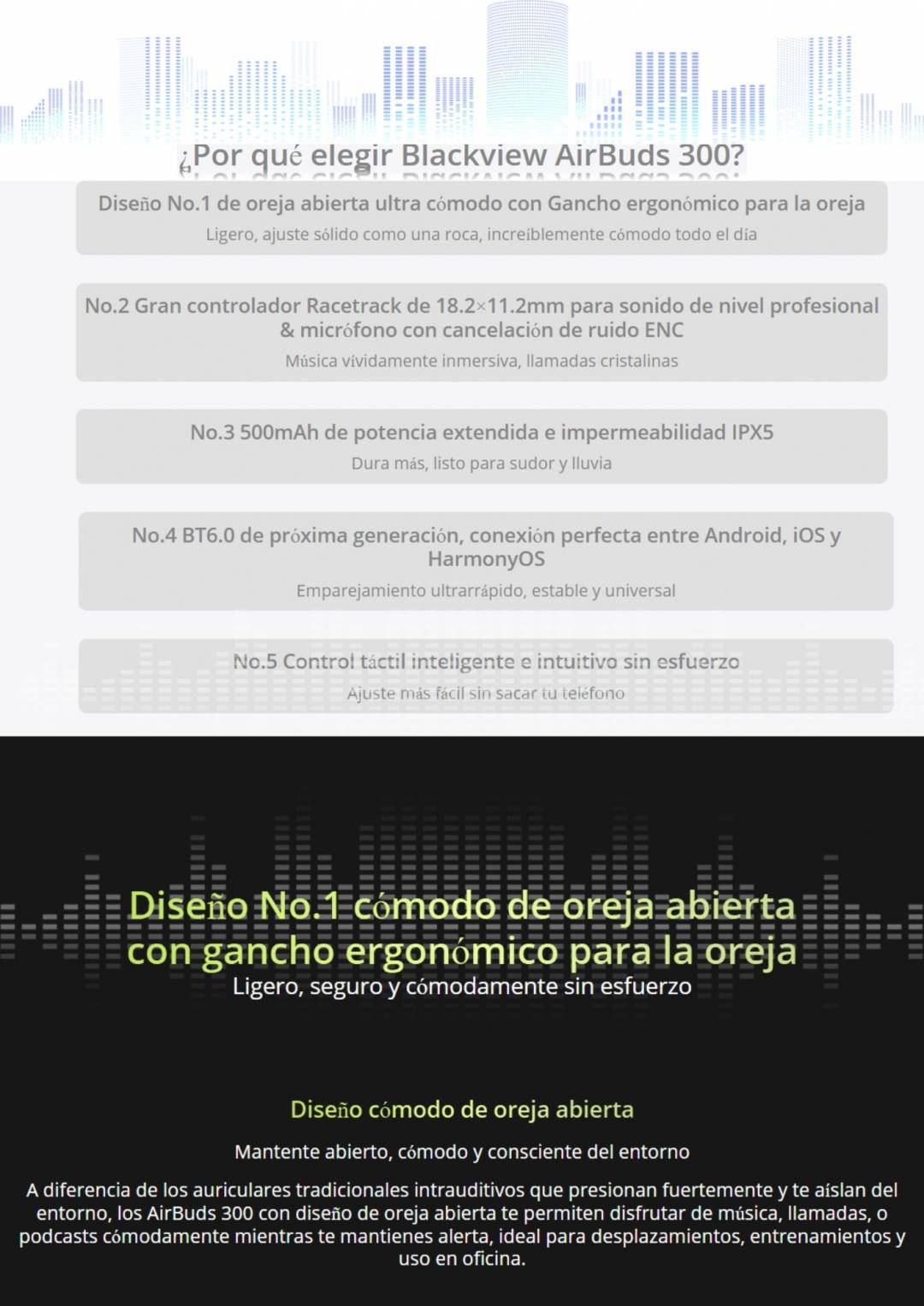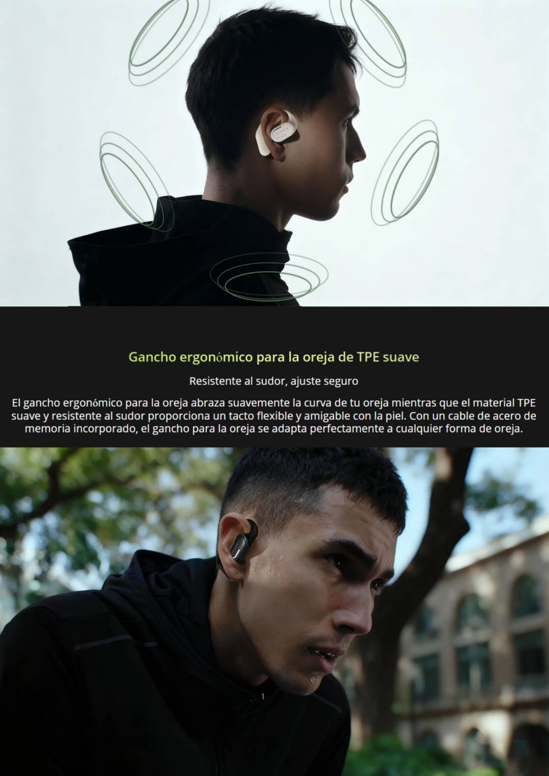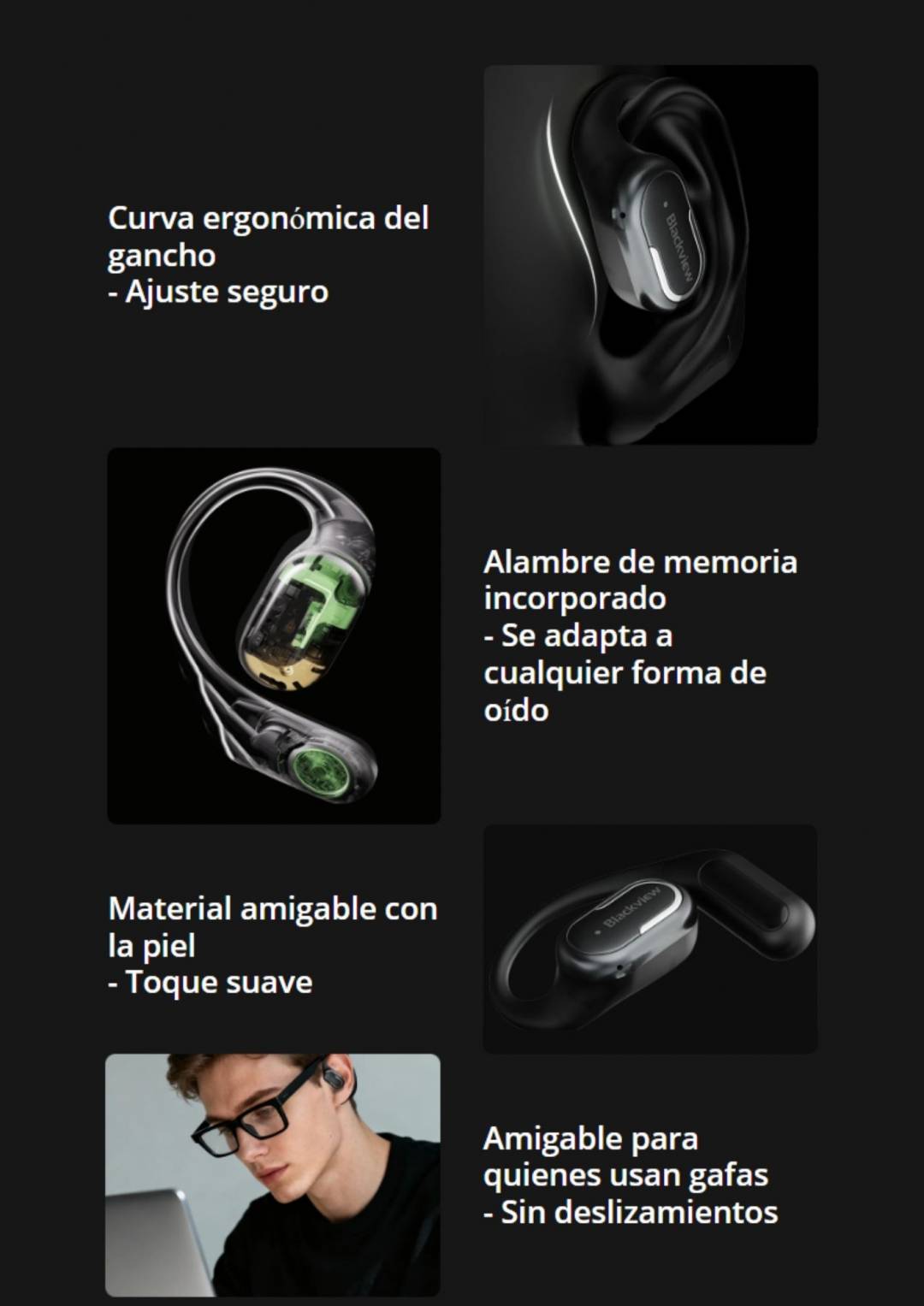 Diseño de oído abierto cómodo con gancho ergonómico para la oreja.
