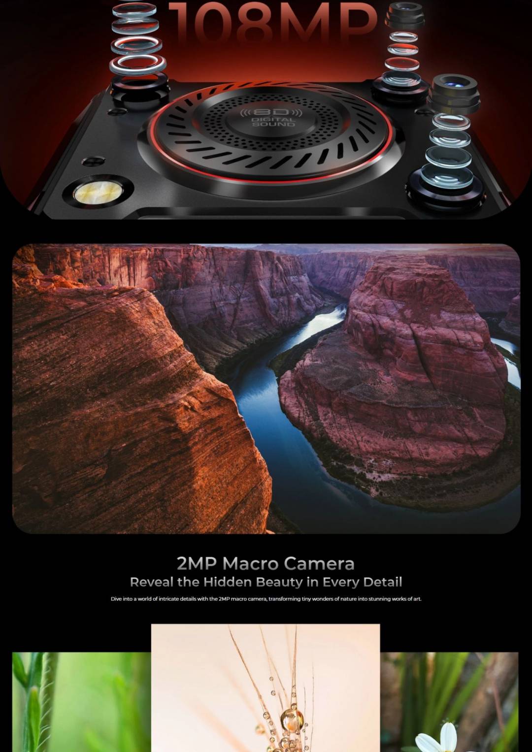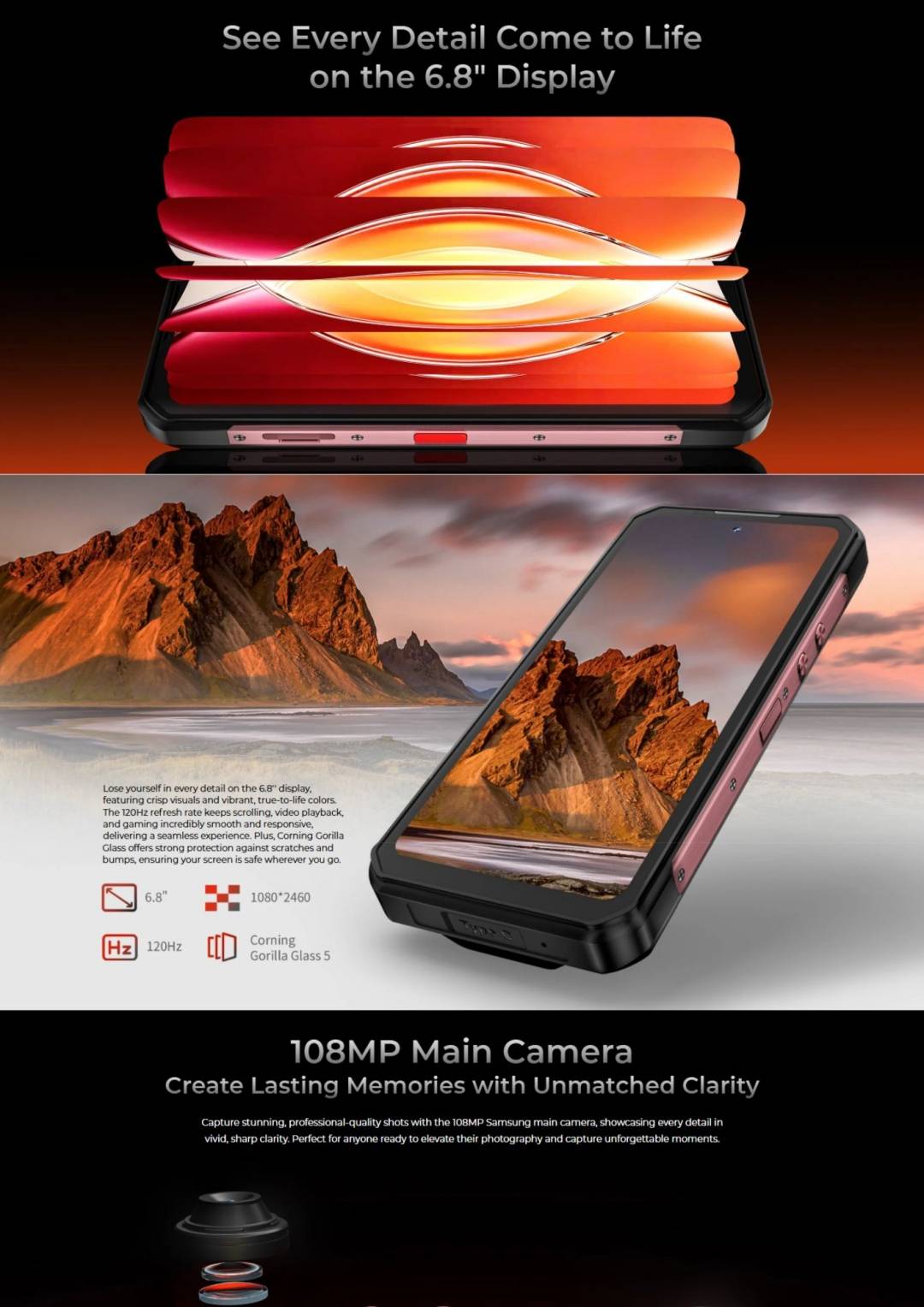 El Oukitel WP55 Pro Combina un diseño resistente con una gran capacidad de memoria, incluyendo 16 GB de RAM ampliables de manera virtual y 512 GB de almacenamiento. Además, posee una destacada cámara trasera triple de 108+8+2 MP y una batería con extensa autonomía.