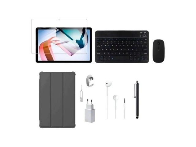 El SET incluye funda, teclado Bluetooth, mouse, lápiz táctil, auriculares y vidrio templado.